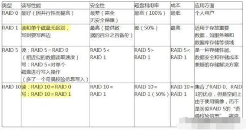 从整体上比较一下RAID0、RAID1、RAID5、RAID6和RAID10的特点: