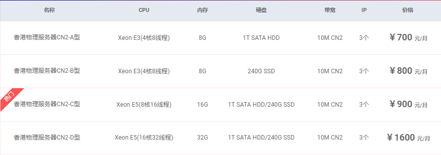 以Red3的香港物理服务器为例,看下图我们可以发现,香港物理服务器配置分为CPU、内存、硬盘、带宽、IP这五大方面。