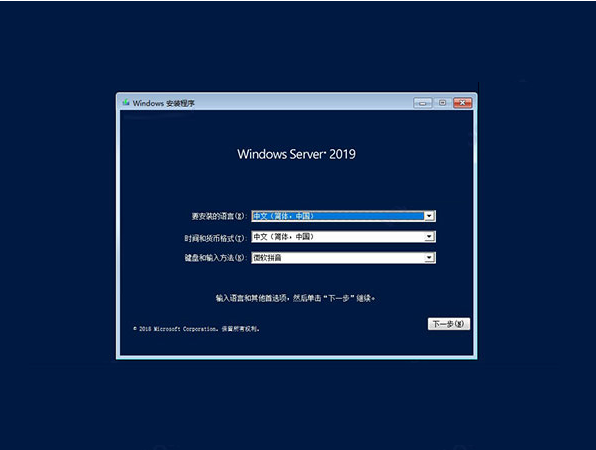 3、创建环境就不必多说,安装环境创建之后,运行虚拟机,即可进入Windows Server 2019的安装操作界面,和win10系统的安装界面很像的,选择呢中文,点下一步。